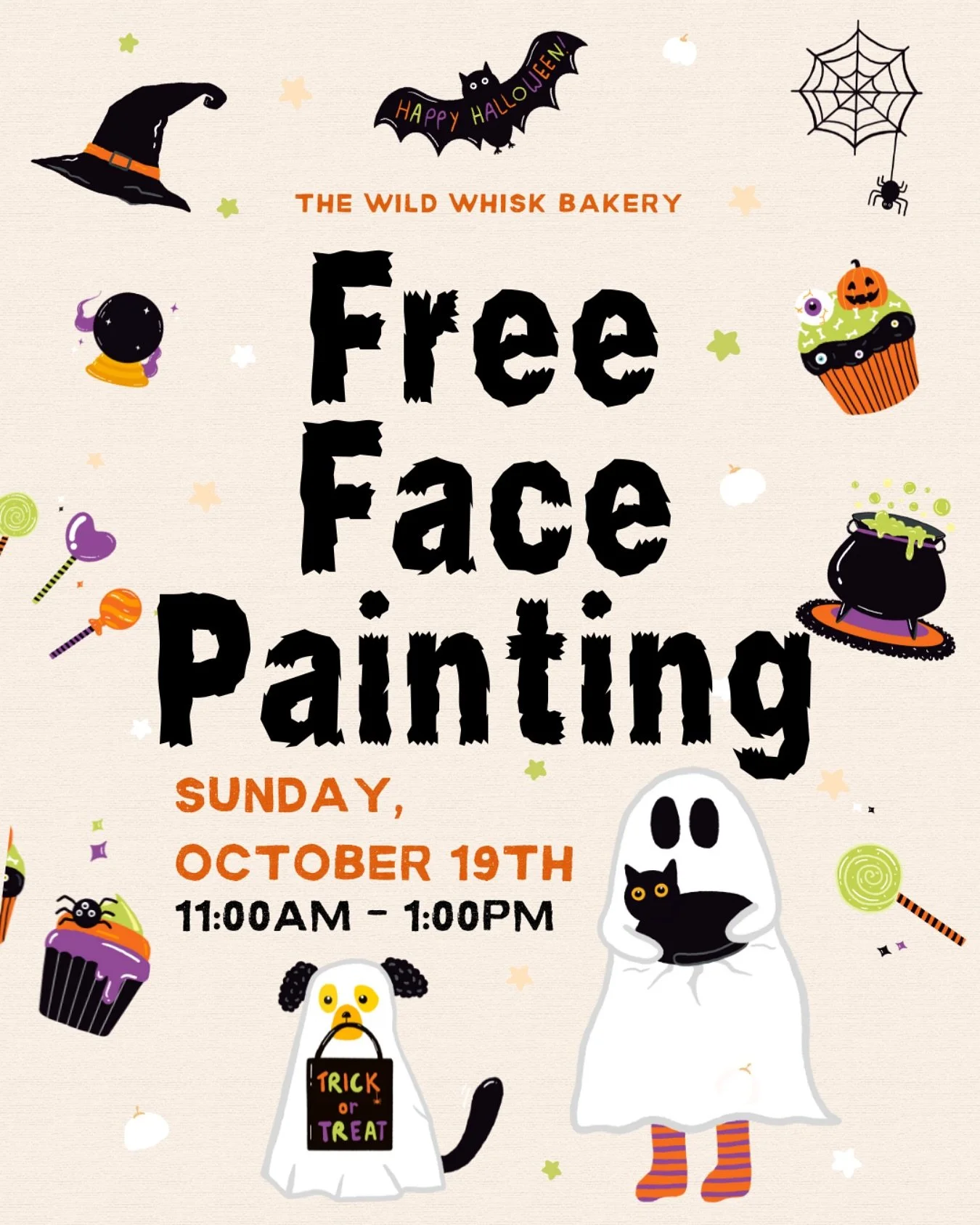 Come on down to The Wild Whisk Bakery to join us for a free community face painting on Sunday October 19th from 11am to 1pm! We will be having the talented @SGVfacepainter help with the face paintings.